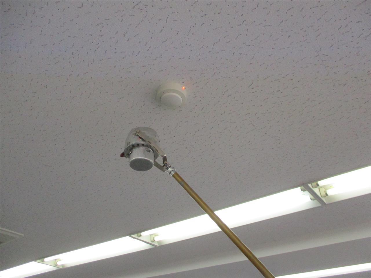 加熱試験器、加煙試験器(通称:あぶり棒)にて感知器の動作確認をします。ランプが点灯すると感知器が働いている状態です。