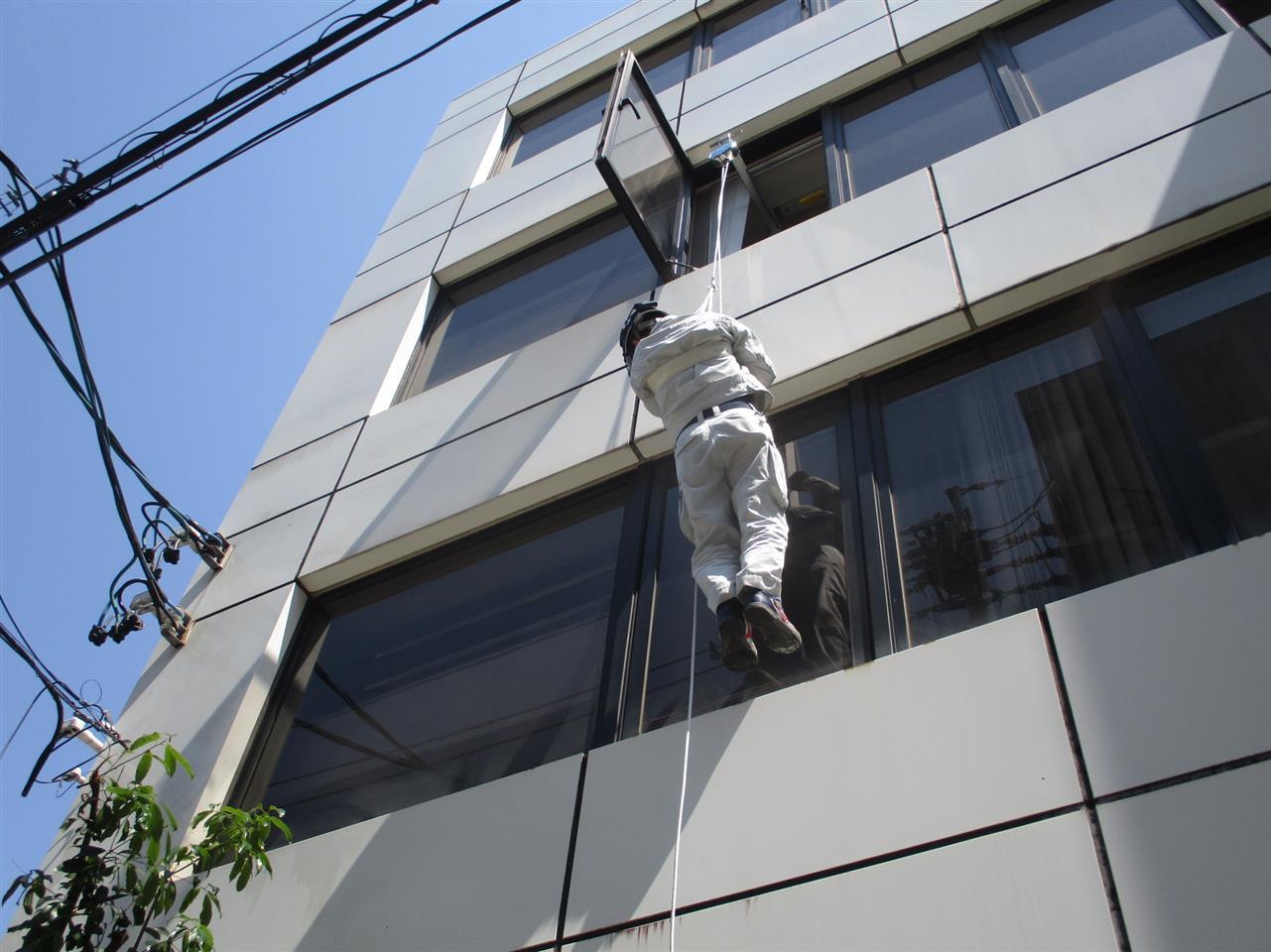 ロープ1本に身をゆだねます。手を放す際、慣れるまでは結構緊張しますが・・・これも万が一の際、お客様が避難するために使用できるかの確認のため、必要な、大事な点検項目です。